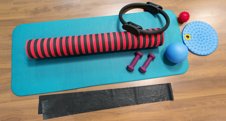 pilatespalloa ja -rengasta, pieniä käsipainoja, nystypalloja, kuminauhaa